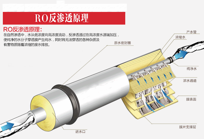 RO是英文 Reverse Osmosis membrane 的縮寫,中文意思是(逆滲透),一般水的流動方式是由低濃度流向高濃度,水一旦加壓之后,將由高濃度流向低濃度,亦即所謂逆滲透原理:由于 RO 膜的孔徑是頭發絲的一百萬分之五( 0.0001 微米) , 一般肉眼無法看到,******、病毒是它的 5000 倍,因此,只有水分子及部分有益人體的礦物離子能夠通過,其它雜質及重金屬均由廢水管排出,所有海水淡化的過程,以及太空人廢水回收處理均采用此方法,因此 RO 膜又稱體外的高科技人工腎臟